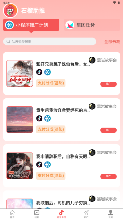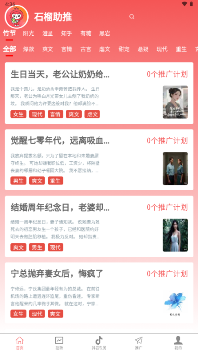 石榴助推app是一款安卓手机小说推广平台,用户可以在线浏览自己感兴趣的小说短剧等内容,完成平台任务即可领取收益奖励,包含各种类型的小说资源内容,都市、言情、古言等等爆款小说类型,对软件感兴趣的话不妨点击下载试试!