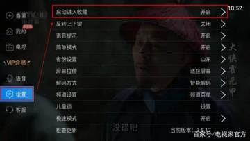 5、按“确定键/OK键”,找到“设置”,选择“启动进入收藏”为“开启”,以后打开电视就可以自动进入“收藏与管理”里了。