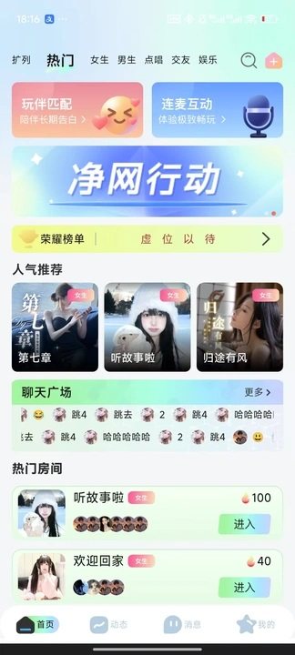 2、通过动态广场、聊天广场、连麦互动等模块,适配不同社交需求,拓展社交圈。