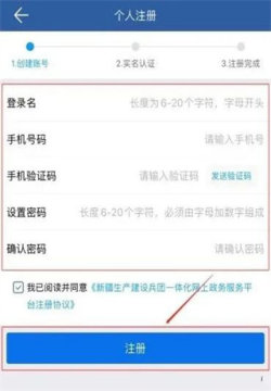 第一步:打开兵政通APP,按照提示和要求,输入登录名,手机号码,手机验证码,登录密码,密保问题即可完成。(用户类型:个人办事选自然人,企业办事选