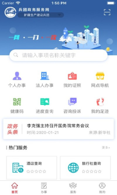 1、注册并完成实名认证后,进入“兵政通”掌上APP首页,点击“新疆生产建设兵团”;