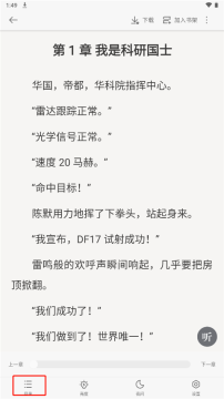 3、进入小说阅读页,我们点击屏幕中间,它会弹跳出功能页,提供目录、亮度、夜间、设置等等功能,我们点击目录;