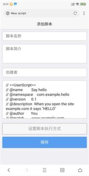 有时候我们面对的不是一个完整的脚本文件,比如我们在网上看到了一些有用的JS代码片段,这个时候我们可以通过复制/粘贴的方式把它添加至浏览器。前往浏览器设置》浏览器脚本》点击右上角的“添加脚本”按钮,选择“新建脚本”。然后,把把代码粘贴至“JavaScript代码”编辑区域点击保存即可。对于符合规范的油猴脚本,无需填写“脚本名称”、“脚本简介”等字段,浏览器会自动从元数据中提取这些信息保存。