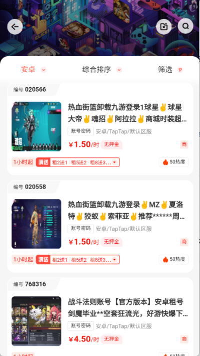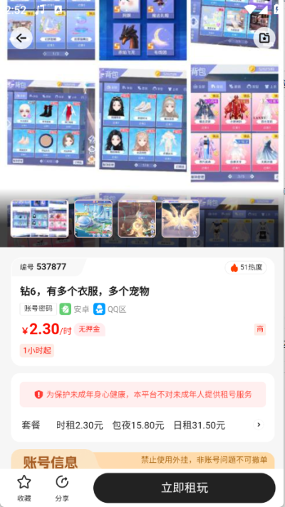 3.有严选和特价专区,分为不同的游戏区,找到要租用的账户。