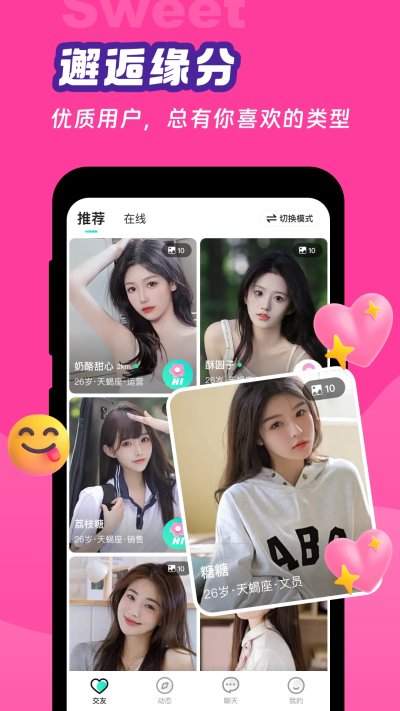 甜你app是一款安卓手机同城交友平台,用户可以在线添加自己感兴趣的聊天对象,智能平台为你推荐附近真人快速匹配,不管是聊日常还是组队开黑,都可以找到合适的对象!对软件感兴趣的话不妨点击下载试试!
