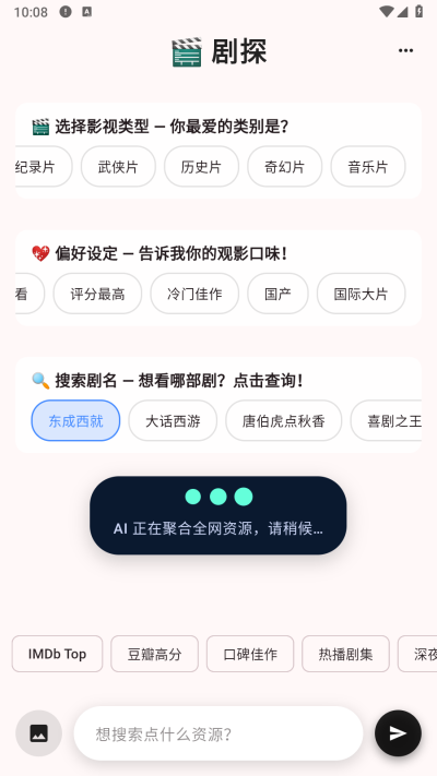 剧探AI是给你强大的AI影视资源聚合搜索观看软件,App支持AI智能搜索、资源检测、多端追剧、AI影视解说等功能,丰富功能随时在线体验,各类精彩影视内容一应俱全,还支持多种格式播放,享受流畅不卡顿的追剧体验,爱看剧的小伙伴欢迎下载。