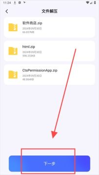 2、其次,进入文件解压界面,选择需要解压的文件,点击【下一步】按钮。