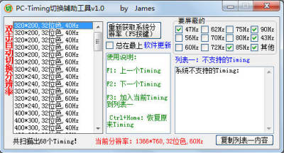 软件适用于切换PC-Timing(电脑分辨率)的用户,设置了特定的快捷键。解决了一些常见的问题。 进入后,双击Timing自动切换PC分辨率。