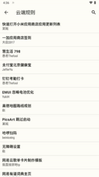 大家点右下角加号,进入云端规则,里面都是广大网友贡献的规则。至于扫码合集,就是支付宝、微信等软件,扫一扫、收付款相关内容。比如长按微信二维码名片,再点右下角勾子,就能把它添加到主页。