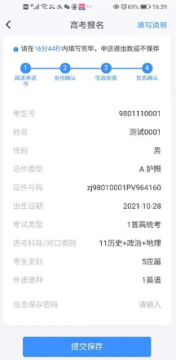 确认填写报名信息无误后,输入信息保存密码后,点击【提交保存】按钮后,提示保存成功后完成报名信息填写。(注意:高考报名期间,考生可随时登录系统修改本人信息,逾期不能再做修改)
