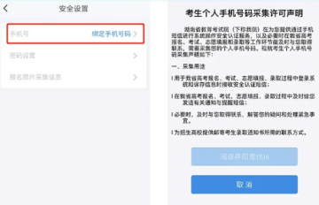 点击底部导航栏【个人信息】,进入个人信息管理页面,点击【安全设置】-【绑定手机号码】,仔细阅读考生个人手机号码采集许可声明,如果同意采集,点击【阅读并同意】后进行手机号码绑定操作。