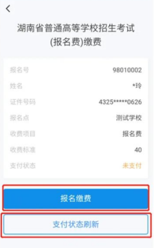 考生确认高考报名费缴费信息,点击【报名缴费】按钮进行缴费。(注意:已成功支付报名费可点击【支付状态刷新】按钮刷新,无需重复支付)