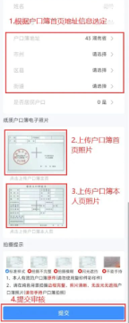 11.上传户口簿首页(含住址信息)和本人户口页电子图片,并选定好户口簿住址信息(选定到街道乡镇一级)