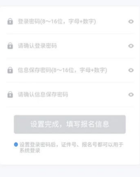 实人认证成功后,APP自动跳转设置登录和信息保存密码界面。修改密码需登录考生APP访问【个人信息】-【密码设置】进行操作,修改密码之前都要通过实人认证。