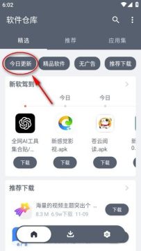 1.打开软件仓库,首页就是精选专区,这里可以查看每天上线的应用,点击“今日更新”即可看到
