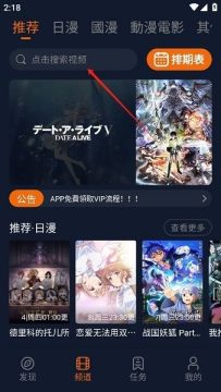 打开囧动漫后,首页“推荐”下面有个搜索框,如图所示,点击就可以跳转到搜索界面;