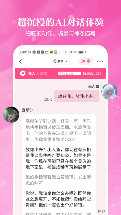 鱼糖是款主打虚拟恋爱对话的应用,核心是让乙女用户和AI男生互动,体验浪漫故事。9个AI男生各有各的人设,从性格到说话方式都不一样,对话时会根据你的回应推进剧情,像在和真实的人谈恋爱。操作特别简单,打开软件选一个喜欢的AI男生,直接打字或发语音聊天就行,不用学复杂的操作。界面是粉色系的,按钮和头像都很可爱,看着就让人有恋爱的感觉,新手也能快速上手。