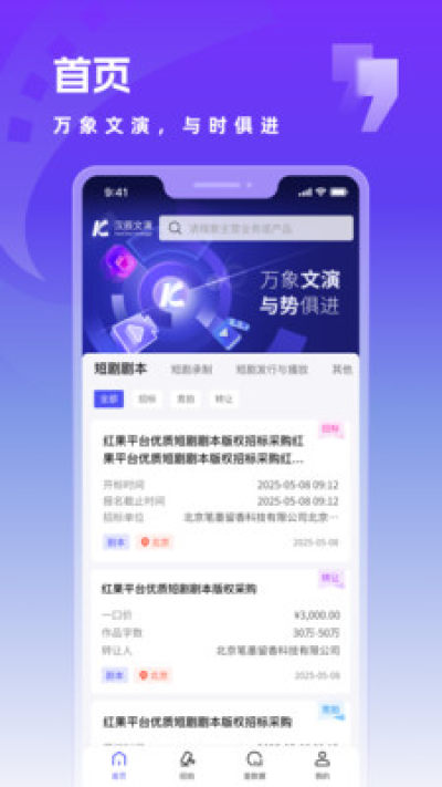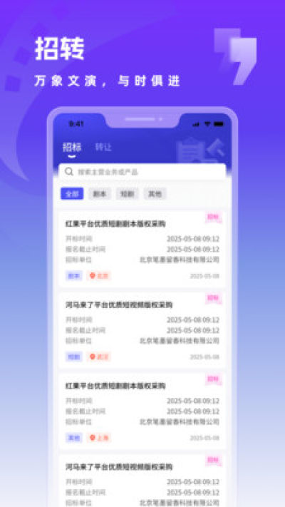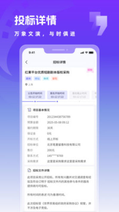 本 APP 面向短剧行业从业者,提供短剧项目招投标、剧本转让及数据服务。在短剧招投标方面,平台每日更新多元题材项目,通过智能算法,依据用户经验、专长等信息精准匹配。同时提供从项目发布到评标的全流程跟踪服务,用户可随时查看进度,专业客服实时答疑。