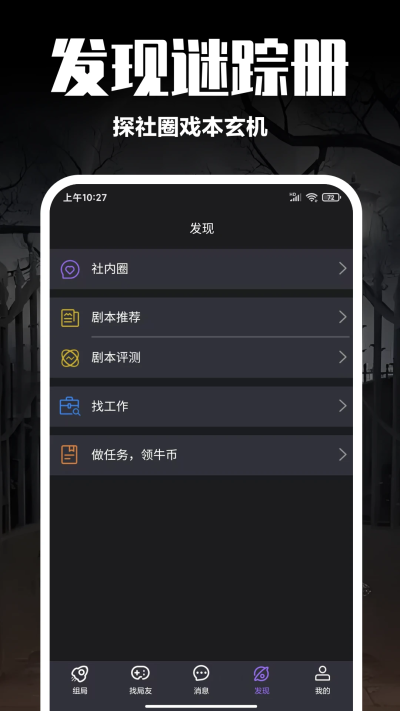 剧牛社是一款以剧本杀为核心的社交、兼职软件。用户可以在线寻找伙伴,线下组队体验不同剧本,结识新朋友。线上组局,线下体验,海量剧本,等你来玩!