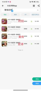 1、打开app,下方切换到“工具”页面,然后在顶部切换到“实况国际服”,搜索框内输入球员名字然后搜索,我们以鲁梅尼格为例,搜索出现了4个鲁美,其中第一和第三个头像相同,只是背景颜色不同,这两张是结转的旧卡。第二张卡是新高光卡,但是国服不会出这张卡因为它的数据和时刻一模一样,第四张是鲁美的德国史诗卡。