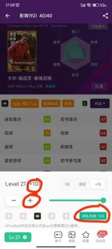 2、咱们继续,还是以今年的票王鲁美为例。点进黄传鲁美,点击左下角“Lv11”按钮,跳出界面,由于突破是给 19点(9.5级),所以点10次加号(增加10级20点),把他的等级加到21级,然后因为我们多给了1点,所以记住加点时要留出1点,然后再点击右下角的“球队风格”按钮切换成100。