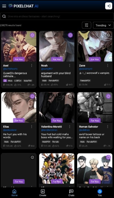 pixelchat软件是一款ai聊天互动软件,广大用户可以在线浏览自己感兴趣的ai聊天对象,随时随地轻松对话互动,在这里体验不一样的虚拟对话,沉浸式带你进入到对话场景之中,对软件感兴趣的话不妨点击下载试试!