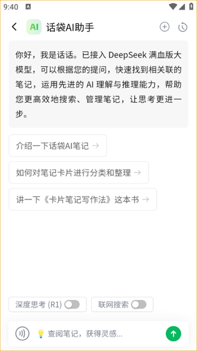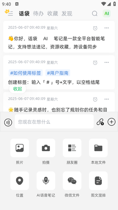 话袋AI笔记是新一代AI卡片笔记产品,具备随时记录、多端同步、资源收藏、笔记串联等多种功能,是你生活、学习、工作中好帮手