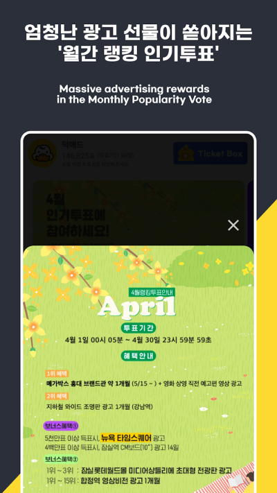 全球地标曝光:累计投票数达标后,可为偶像解锁纽约时代广场LED广告牌、首尔地铁核心线路广告、韩国连锁影院品牌贴片广告等黄金宣传位,让偶像形象席卷全球!