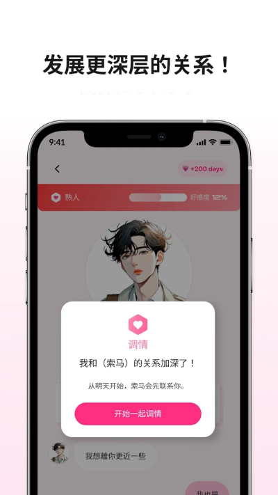 沉浸式恋爱体验:聚焦恋爱场景,为用户打造接近恋爱手游的沉浸式聊天体验。通过“熟人→朋友→暧昧→恋人→结婚”的递进式互动框架,将情感关系具象化为可视化成长路径,强化用户的目标驱动力,同时通过特殊节点提升情感沉浸感。