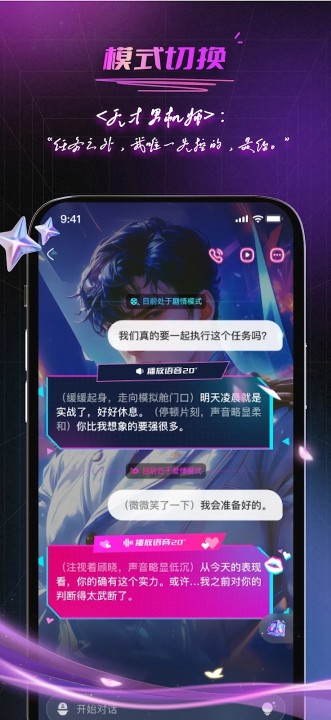 情景剧场模式:1000+预设对话场景(如“深夜酒吧倾诉”“科幻宇宙探险”),一键开启主题对话,降低创作门槛。