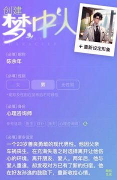 5、个性化定制:你还可以根据标签快速获取自己感兴趣的梦中人物,并定制专属头像。此外,你还可以补充设定,塑造独一无二的他。
