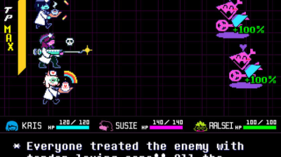 角色互动:对话选择影响伙伴关系,例如安抚Susie的暴躁性格或揭露Ralsei的王子身份之谜。