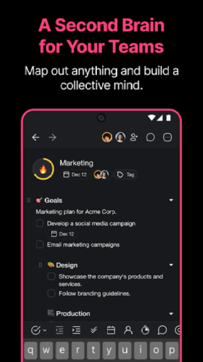 Taskade汉化安卓版是一款AI驱动的多功能在线协作平台,软件通过集成任务管理、项目管理、思维导图、实时协作和自动化工具,通过AI代理和动态工作流生成功能,减少重复性操作提升效率,团队成员可同步编辑和更新任务,通过评论和视频通话功能及时解决问题,覆盖主流操作系统和设备,确保用户随时随地访问和管理项目!