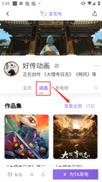 2、以作者《好传动画》为例,我们进入作者页面选择至“动态”点击其中的“作品集”-查看全部作品