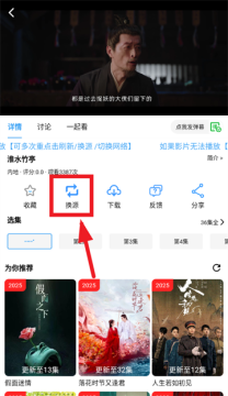 下载安装并打开云云视频app,进入后可以在推荐板块或者直接搜索进入到自己喜欢的影视播放界面,若无法播放或播放卡顿,可以点击换源按钮