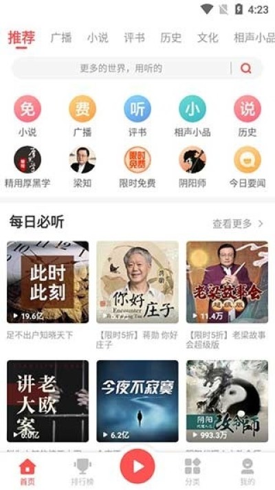 首页提供了丰富多样的分类选项,包括小说、评书、直播、历史、头条等,方便用户快速找到感兴趣的内容。