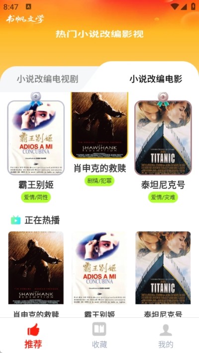 1、在推荐页面中提供小说改编电视剧、小说改编电影等不同版块内容;
