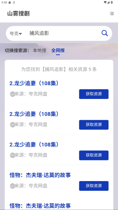 3、提供“本地搜”和“全网搜”两种搜索源,用户可根据需求切换,扩大资源查找范围。