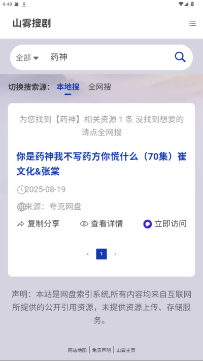 山雾搜剧app最新版本是一款搜索影视资源的搜索工具软件,软件支持在夸克网盘中快速检索各类影片资源,无论是热门短剧、经典电影还是热播电视剧都能一键精准查找,用户可自由选择在线流畅播放或下载保存,贴心的搜索记录与收藏功能,让用户轻松管理常看和想看的影视资源!