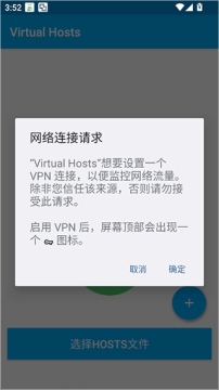 4、导入规则后,回到应用主界面点击启动按钮,应用会请求创建本地***连接的权限,确定即可