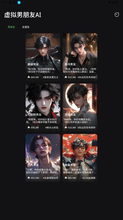 虚拟男朋友AI聊天最新版是一款无限制沉浸式的恋爱聊天陪伴软件,软件里有丰富的AI男女朋友角色可以选择,用户们可以选择不同风格的虚拟伴侣,虚拟角色可以进行深度对话,根据用户的喜好和习惯调整对话风格和内容,24小时陪伴在线随时随地的恋爱体验!