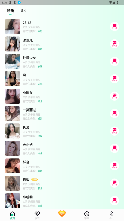 3.根据你的地理位置,为你精选附近最新在线的用户,让能够轻松找到身边有趣的灵魂,与陌生人进行线上交流,相互了解。