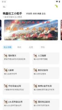 楠鑫社工小助手是一款免费的安卓多功能工具箱软件,提供包括QQ号查询、游戏ID查询在内的多种实用工具,应用范围广泛,可满足用户多样化的查询需求。软件持续更新功能模式,致力于为用户带来便捷、新颖的体验。推荐有需要的用户下载使用。