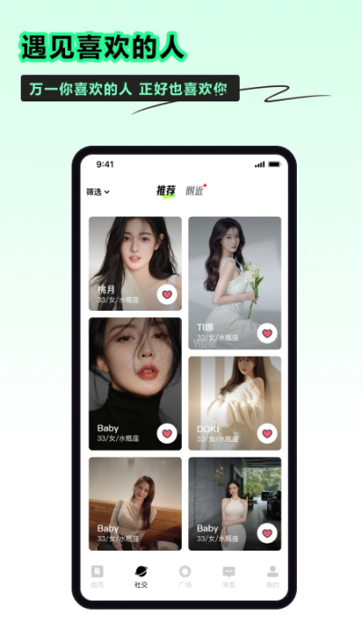 5、在社交页面即可筛选和查看推荐以及附近的网友,便于找到对的人互动聊天;