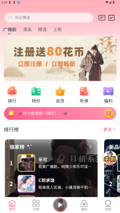 搜索与播放:支持通过搜索框、分类、排行榜查找广播剧,点击即可播放,支持进度调节、音量控制等基础操作。