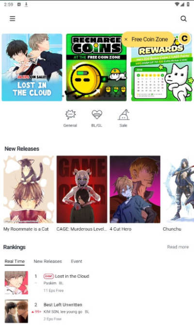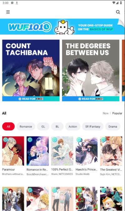 2、丰富内容储备:涵盖 BL、GL、悬疑、武术等多种类型漫画,内容设计多样,满足不同用户的阅读喜好,无论是偏爱经典题材还是小众风格,都能找到合适内容。