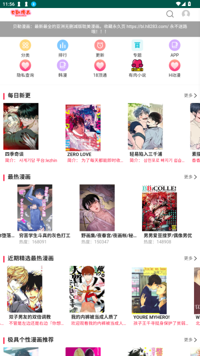 贝勒漫画免费版app是一款海量漫画资源的免费漫画阅读软件,软件里拥有各种题材的韩漫作品,每日更新连载内容同步最新章节,提供了排行榜和智能的搜索功能,让用户可以快速找到喜欢的作品,还有丰富个性化的设置给用户最好的阅读环境,喜欢腐向韩漫的小伙伴不要错过!