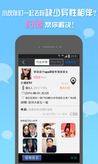 3.一旦批准报名者,参加者和发起者即可看到对方电话号码,保证约会顺利进行;