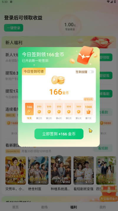 设置签到、观看短剧赚金币功能,用户日常使用软件即可积累金币,且金币提现秒到账,让用户在娱乐的同时还能获得额外收益,提升使用积极性。