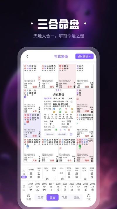 【提供四种星盘类型】飞星盘、三合盘、四化盘、倪师盘。立足于典籍,严格校对数据,满足多种流派对于星盘解读的需求。